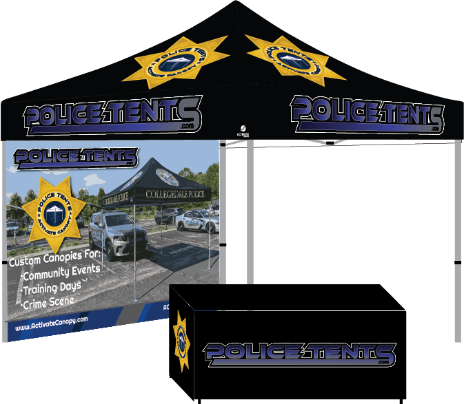 Activate Canopy is excited to be releasing the new event package for your police department’s needs. This package includes a custom 10×10 tent, sidewall, and table cover that will make your department stand out at your next event!